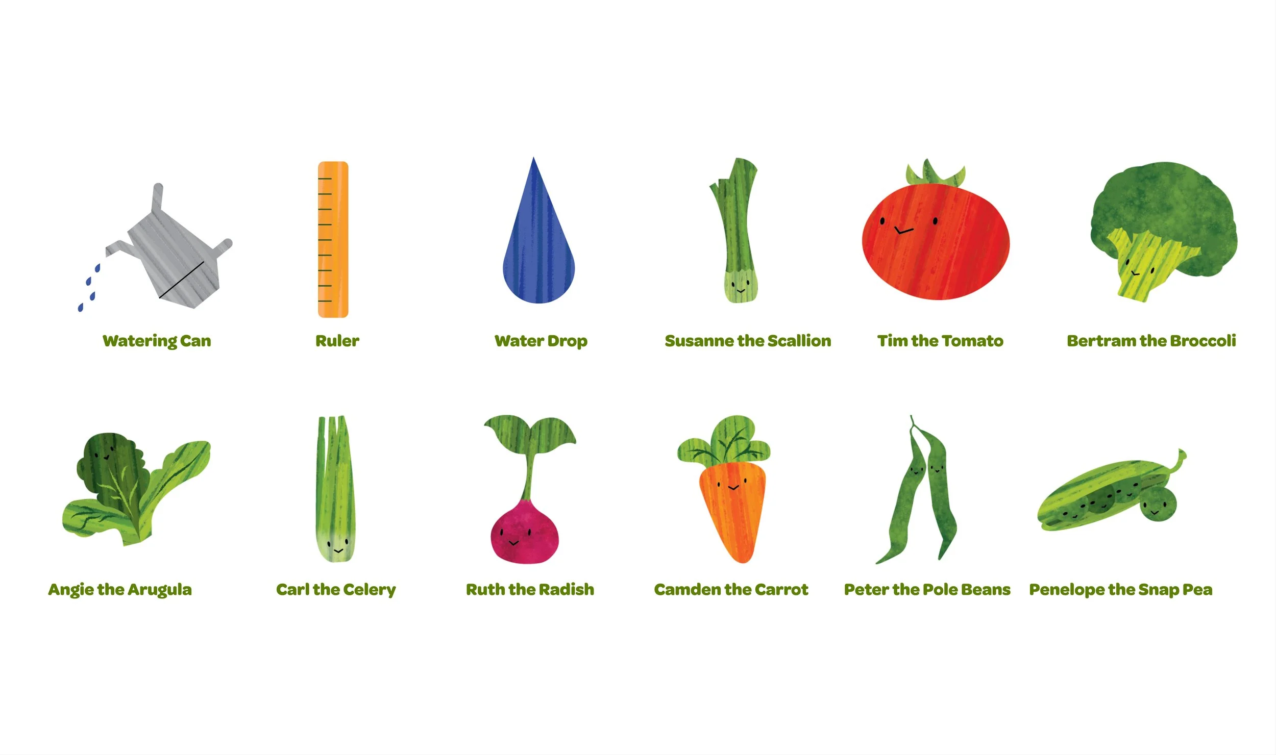 For the kid’s journal, they have to fill out a calendar with stickers for how to take care of their plants. The stickers include the characters of the plants they are growing, a ruler (to encourage children to measure their plants), and a watering can so they can be on a watering schedule. These characters were also developed throughout the book’s activities since kids resonate well with characters.