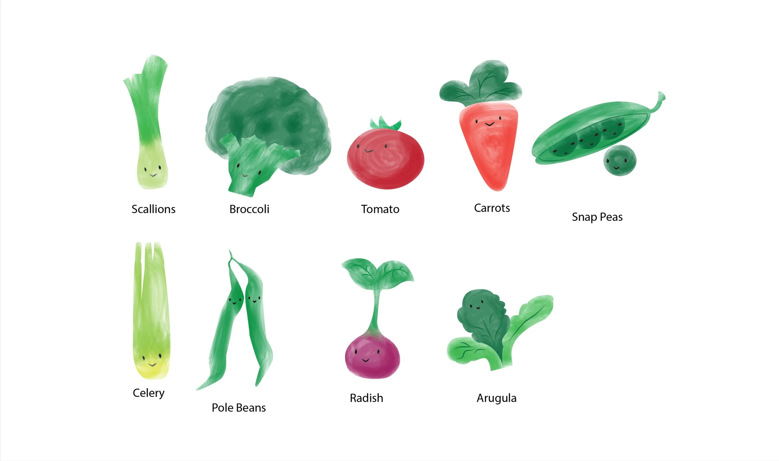 I developed the shapes, but for the first iteration of these characters I used a watercolor brush. However, we decided to go with something that children would be familiar with, which was an Eric Carle inspired art style.